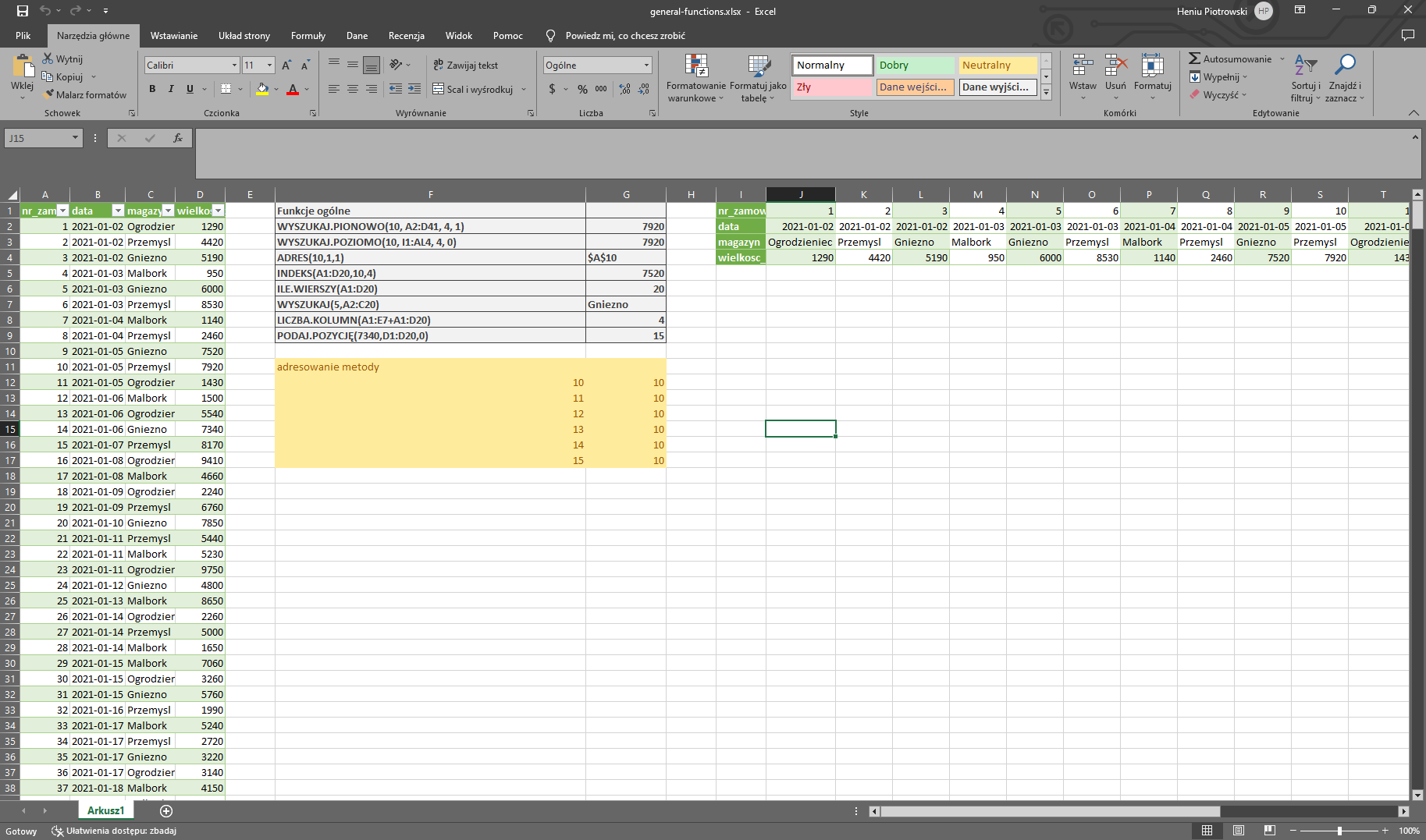 Przerobimy sobie dzisiaj funkcje ogólne w pakiecie MS Excel. Będą to następujące funkcje: WYSZUKAJ.PIONOWO(), WYSZUKAJ.POZIOMO(), ADRES(), INDEKS(), ILE.WIERSZY(), WYSZUKAJ(), LICZBA.KOLUMN(), PODAJ.POZYCJĘ(). Poniżej znajdą także Państwo zdjęcie/a obrazujące materiały z kursu na YT oraz plik .xlsx, z którym możecie się Państwo zapoznać. Serdecznie zapraszam!