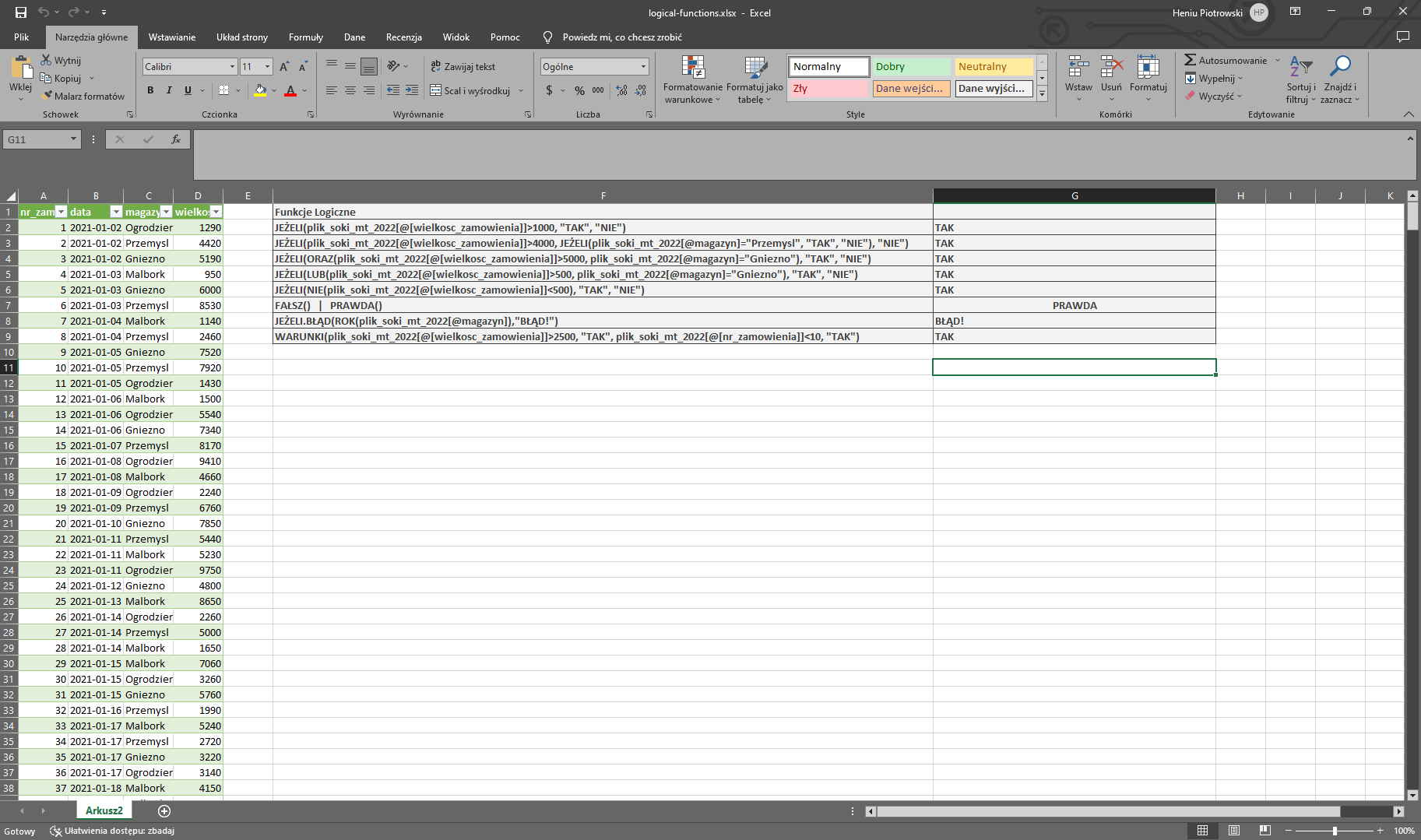Przerobimy sobie dzisiaj podstawowe funkcje logiczne w pakiecie MS Excel. Będą to następujące funkcje: JEŻELI(), ORAZ(), LUB(), NIE(), FAŁSZ(), PRAWDA(), JEŻELI.BŁĄD(), WARUNKI(). Poniżej znajdą także Państwo zdjęcie/a obrazujące materiały z kursu na YT oraz plik .xlsx, z którym możecie się Państwo zapoznać. Serdecznie zapraszam!